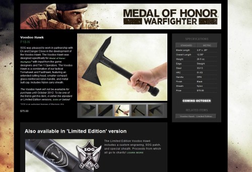 They dropped the “Medal of Honor” from the weapon description, and removed the Limited Edition version… but it’s still called the “Medal of Honor Voodoo Hawk” in the pre-order section at the bottom. I wonder if I could still get it engraved…? Just kidding, what the crap would I or anyone else in the world do with a tomahawk? I guess I could always learn to juggle.