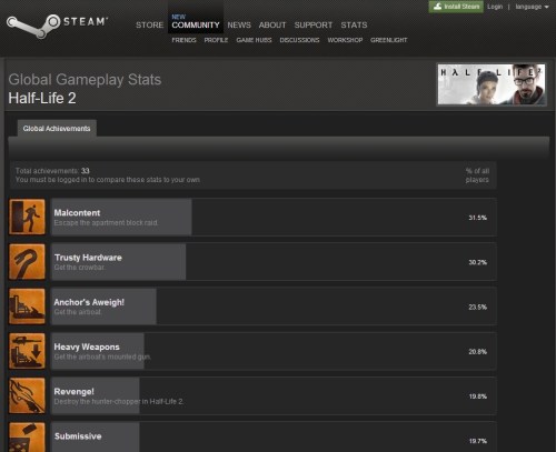 Some of the graphs in Bruce’s piece paint a not-100%-accurate picture of the gaming landscape, in no small part due to the fact that people who use services like Raptr are definitely more into gaming and completion statistics than the typical person. Nearly 30% of players beat GTA IV? More than 70% beat Halo 3‘s campaign? First of all: no way. Second of all: no way. The CNN story puts completion stats at closer to 10%, and that’s probably much closer to the actual number. Don’t believe me? Open up Steam and look at how many people have the achievement for beating the tutorial – just the tutorial – of any given game. If that number is over 70% percent, you’re doing pretty well. And that’s just the first level.